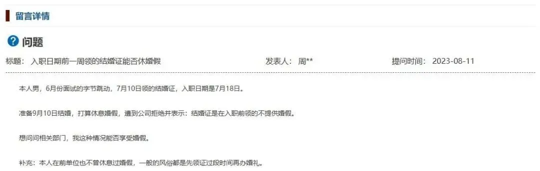 无独有偶,天津一网友入职前一周领证请婚假被拒,人社局也明确回应其符合休假条件。